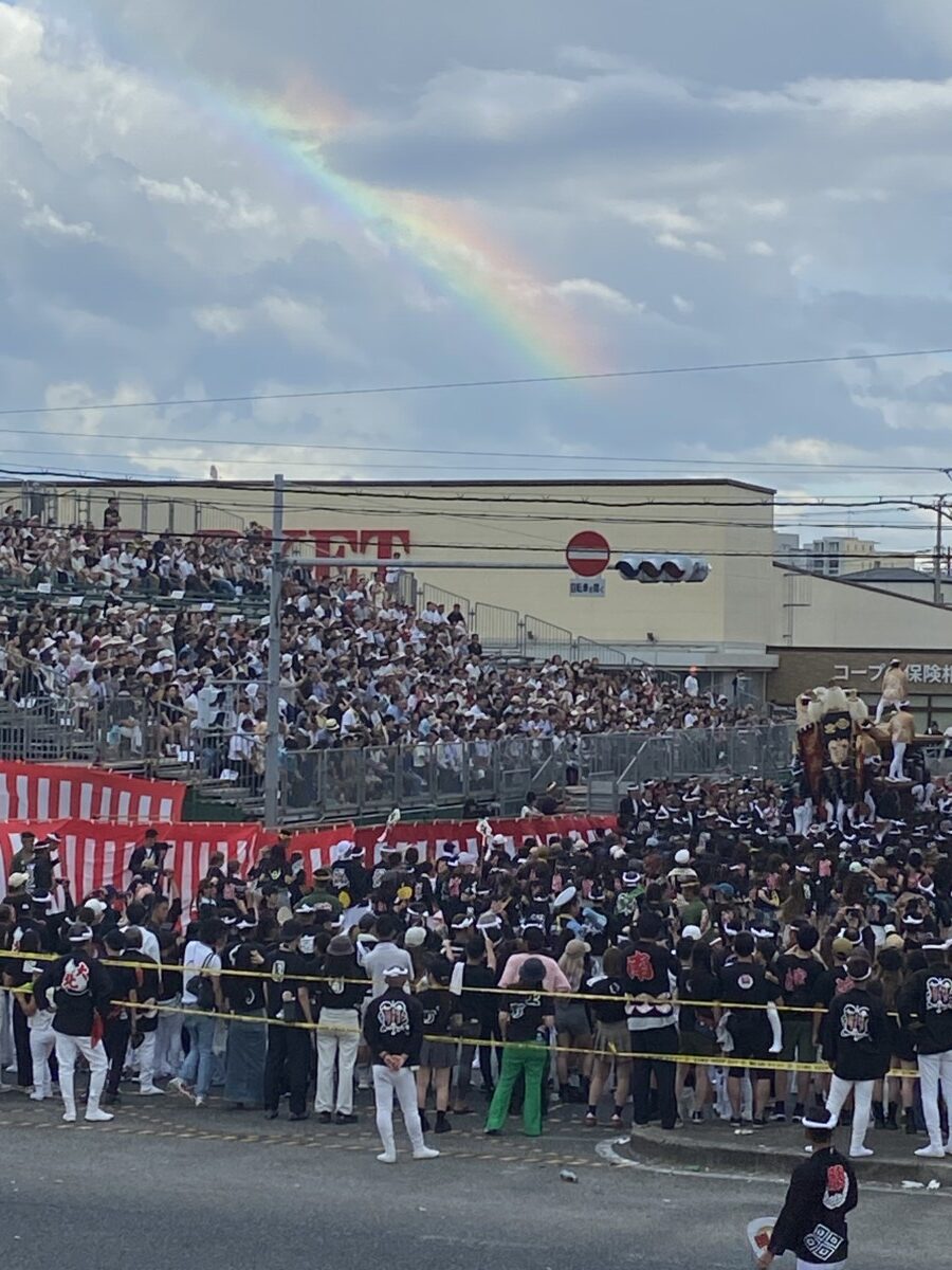 当日は小雨も降ったのですが祭りが佳境に入ると空には虹がかかりました。空も祝福しているようでだんじり祭りは