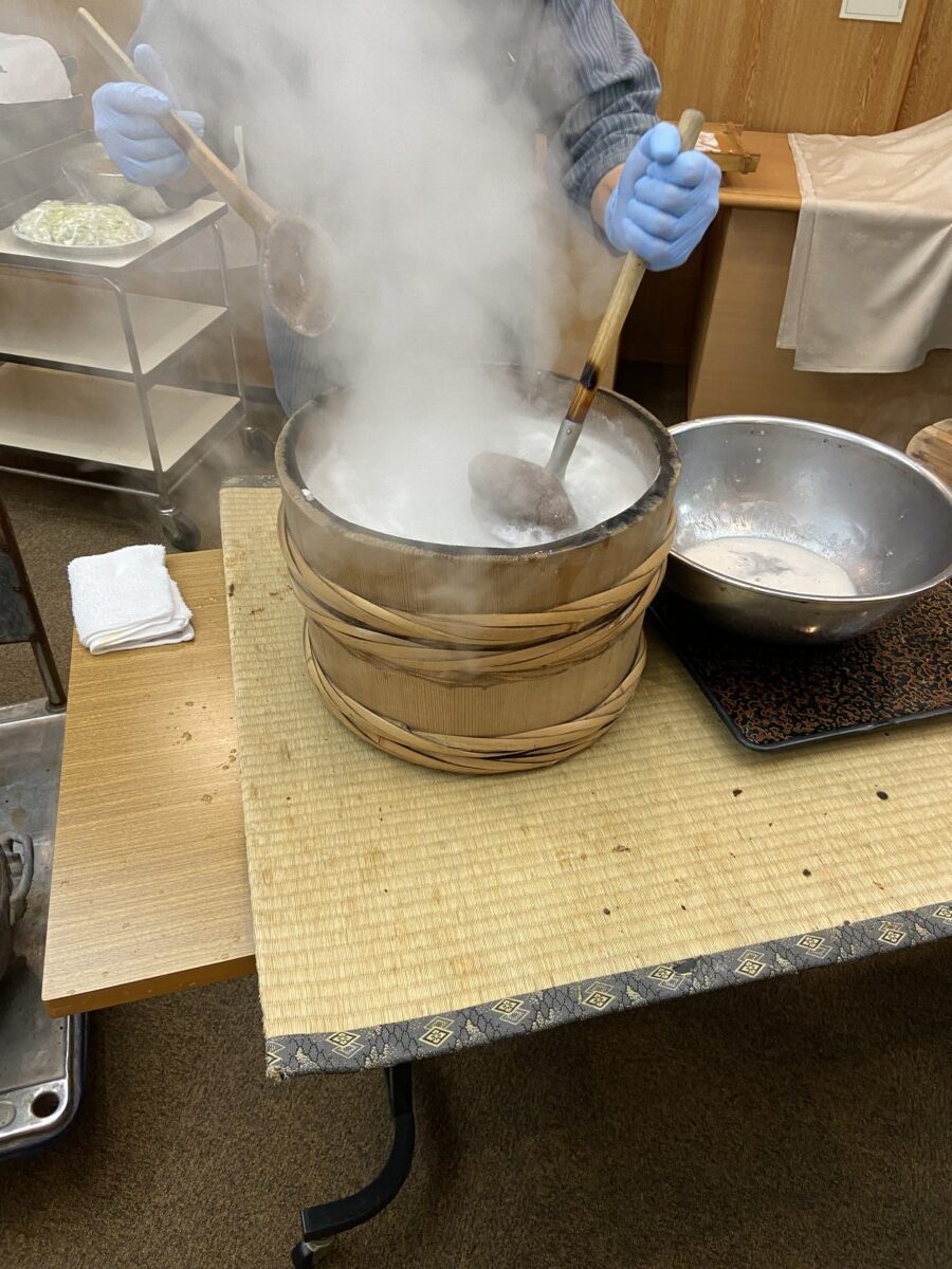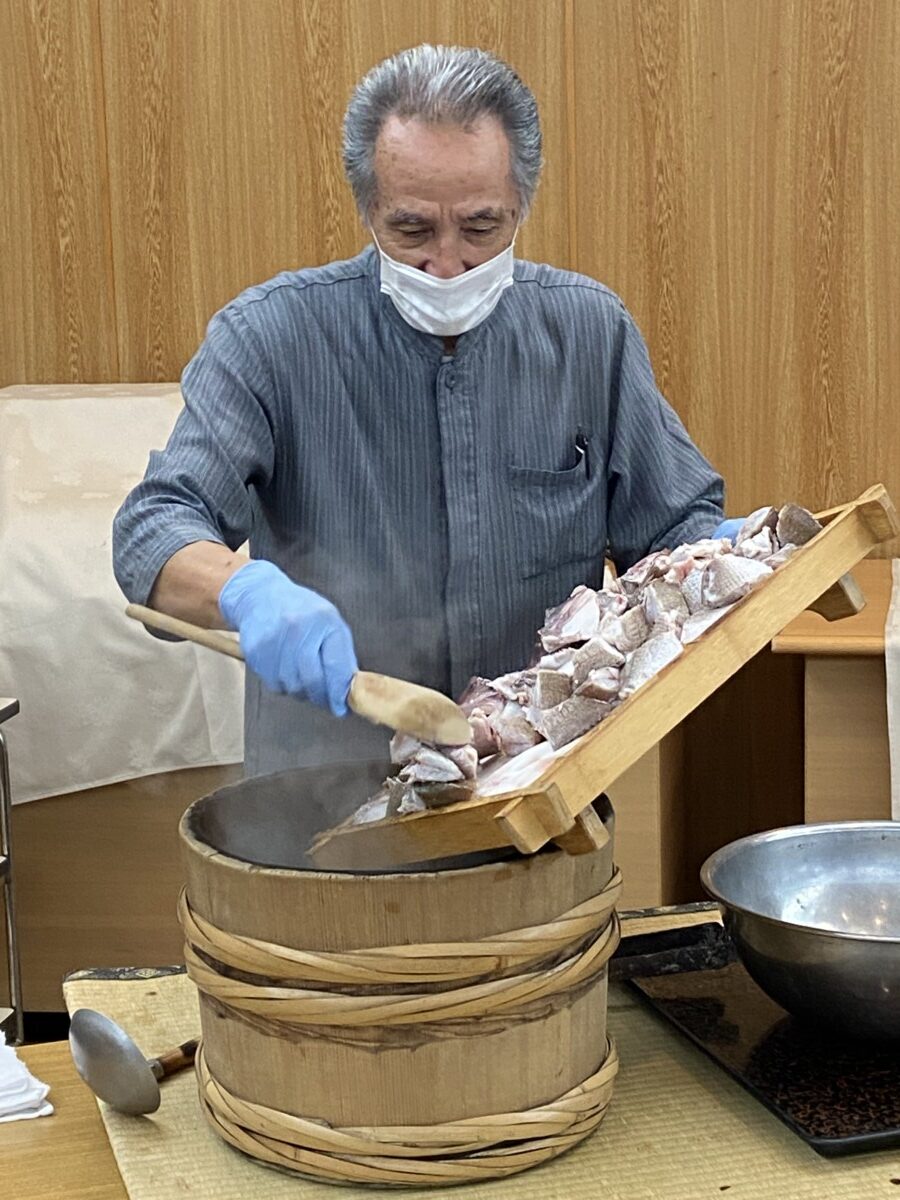 男鹿名物の食べ物といえば石焼料理。木桶に入れた汁や具材の中に真っ赤に熱した石を入れて一気に