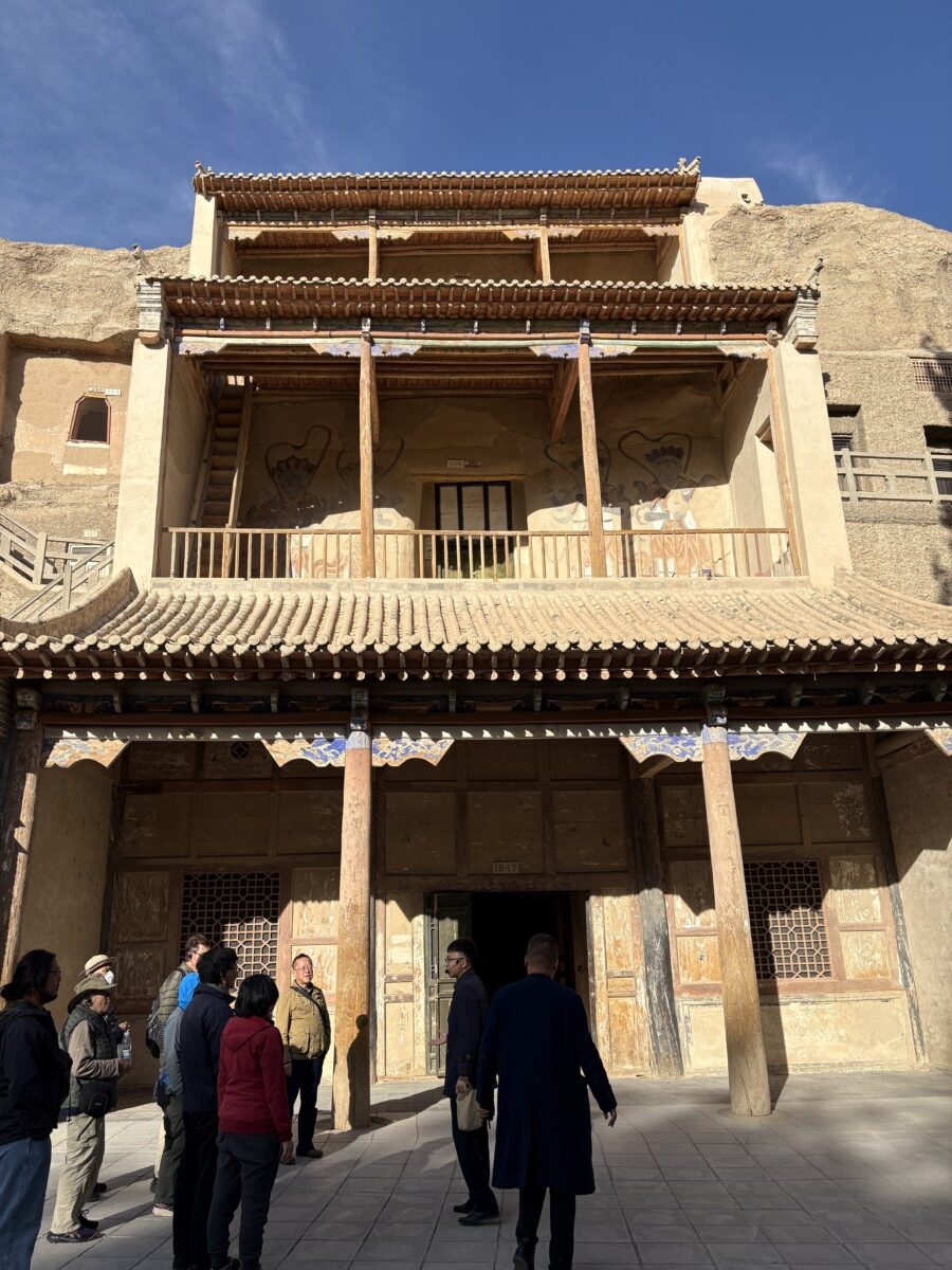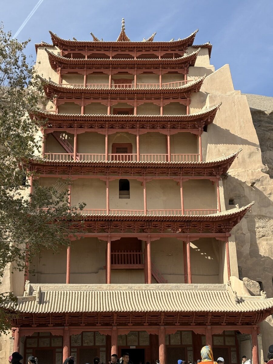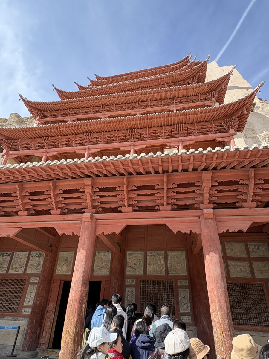敦煌近郊にある莫高窟にも行きました。世界最大規模の仏教美術でいくつもの洞穴?に千数百年前の美しい絵が今も色鮮やかに残っています。専任ガイドさんの案内でいくつかの部屋を巡ります。ガイドさんは日本語もうまく見た目もきれいな人ばかりで最後には旅行者がみんなファンになり彼女と写真を撮っていました。